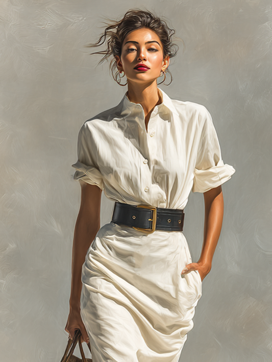 A classic and effortlessly elegant midi dress featuring clean lines, a tailored collar, and a flattering belted waist—perfect for versatile styling across occasions.