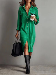 A comfortable and stylish midi dress crafted from soft corduroy, featuring a loose silhouette, double chest pockets, and a classic single-breasted front. Perfect for everyday wear with a touch of retro charm.