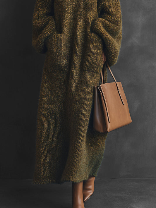 This olive-green maxi sweater dress combines comfort and fashion with its oversized design and sophisticated color. It's a versatile piece for creating a cozy yet stylish look during the colder months.