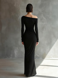 A black jersey maxi dress with an off-shoulder neckline and ruched detailing. It creates a sleek, draped silhouette perfect for formal evenings.