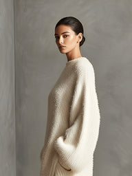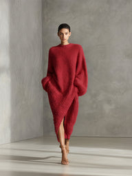 Women's Cream Elegant Faux Mink Knit Asymmetric Slit Midi Dress