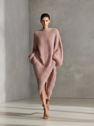 Women's Cream Elegant Faux Mink Knit Asymmetric Slit Midi Dress MDA024