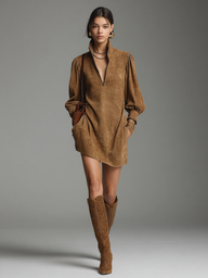 A stylish and modern mini dress crafted from soft suede fabric, featuring a cozy turtleneck and a convenient front zipper. The loose fit makes it effortlessly chic and comfortable, perfect for day-to-night wear and adding a sophisticated touch to your wardrobe.