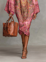 This charming midi dress features a delicate paisley print with a classic round neckline. The trumpet-shaped long sleeves and loose fit create an elegant and comfortable silhouette, perfect for various occasions.