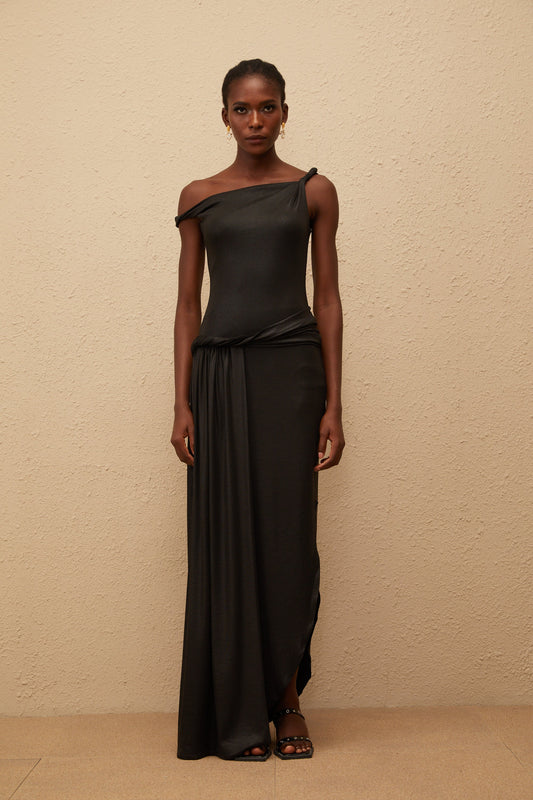 Samantha Black Asymmetrical Gathered Maxi Dress