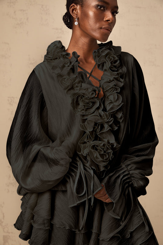 Zéphyrine floral-appliqué tiered mini dress in Black