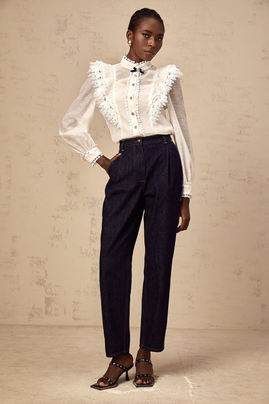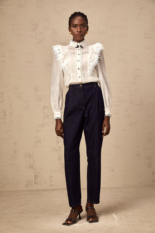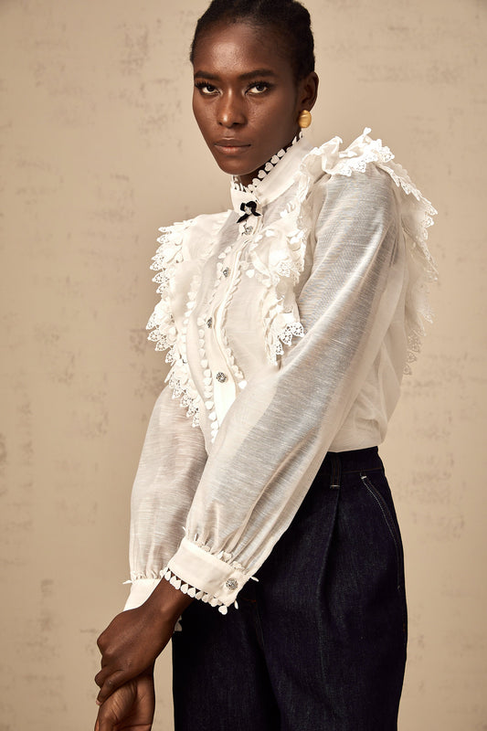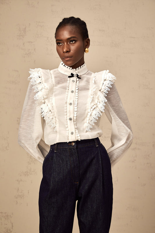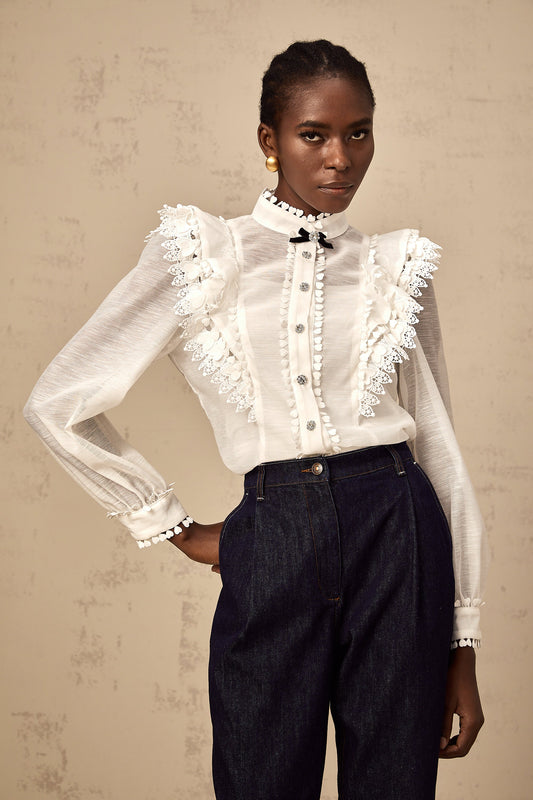 Capucine white lace-trim semi-sheer shirt