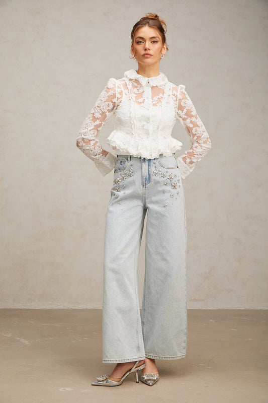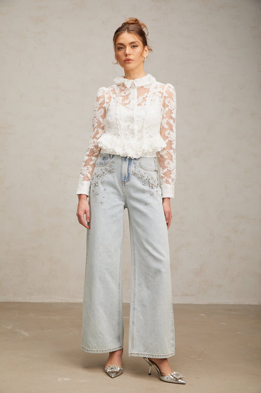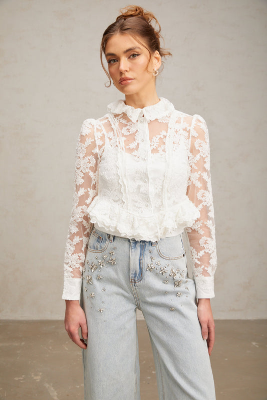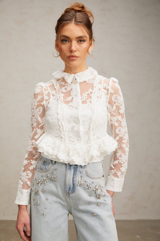 Karine white floral-embroidered lace blouse
