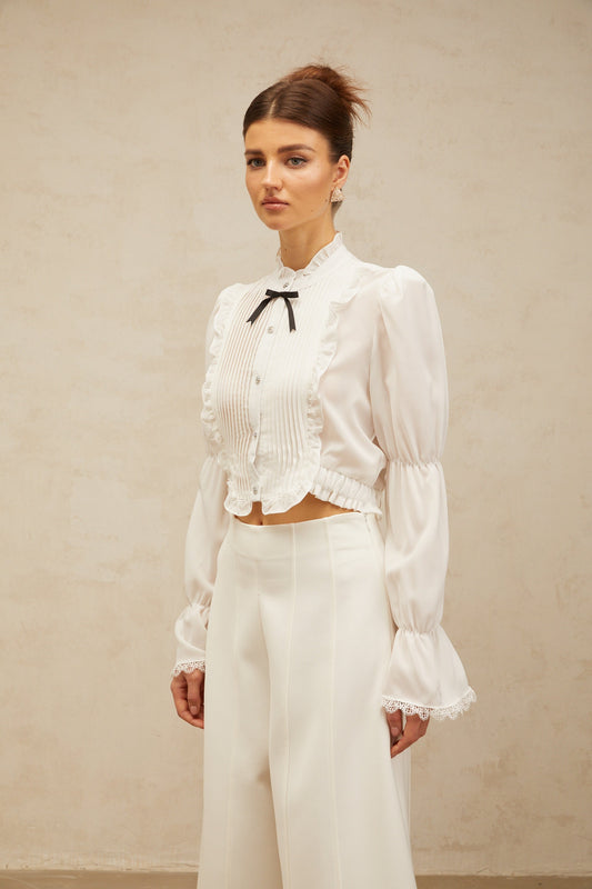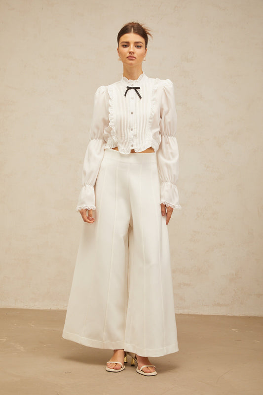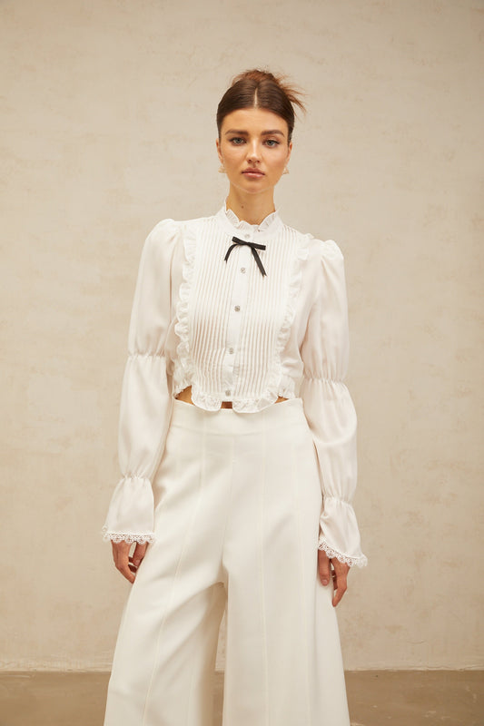 Paulette white bowknot shirred-panel ruffled shirt