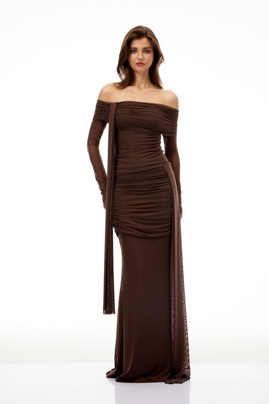 Hyacinthe Brown Asymmetrical Ruched Top & Skirt Set