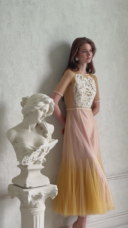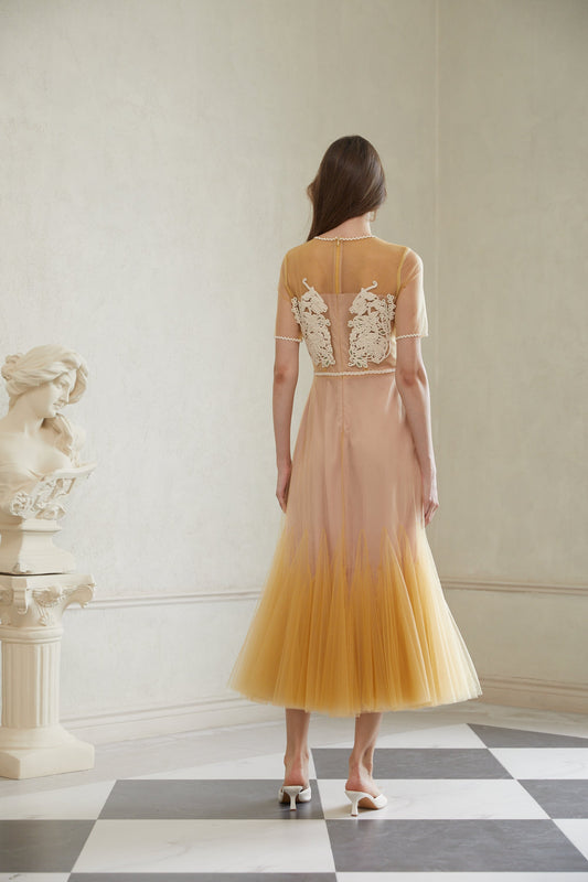 Despoina Yellow Floral Braided Tulle Midi Dress