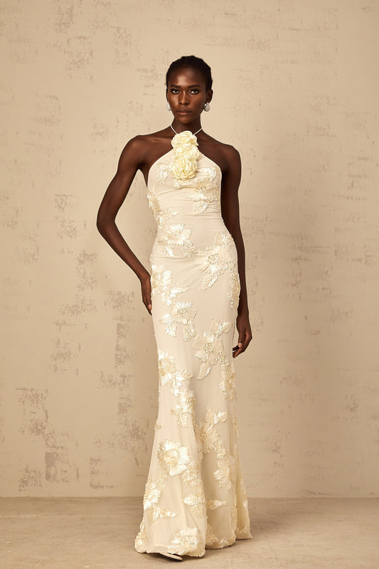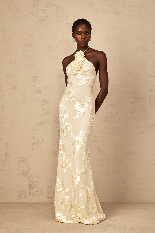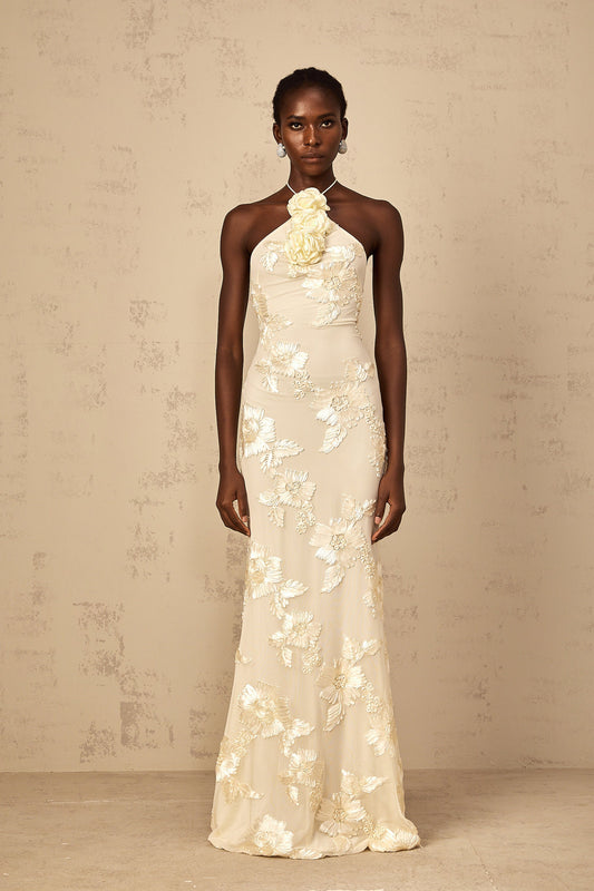 Melanie Neutrals Embroidered Halterneck Maxi Dress