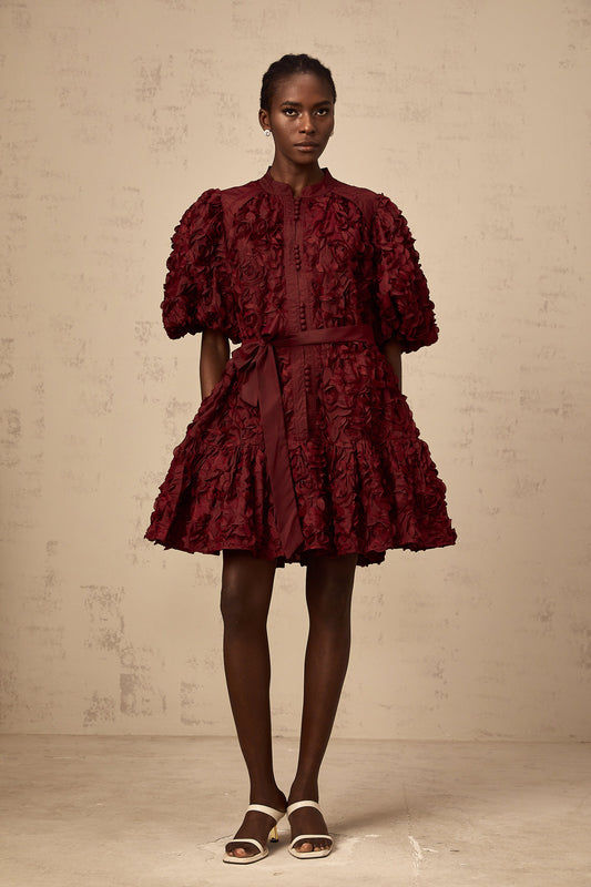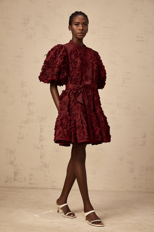 Ségolène wine-red 3D-petal puff mini dress