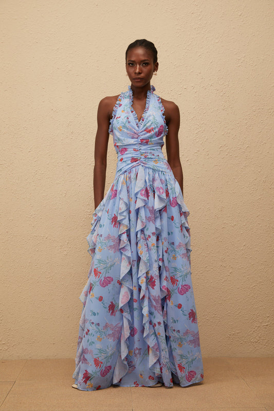 Thaïs Blue Ruffled Floral Print Maxi Dress