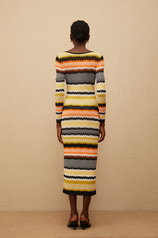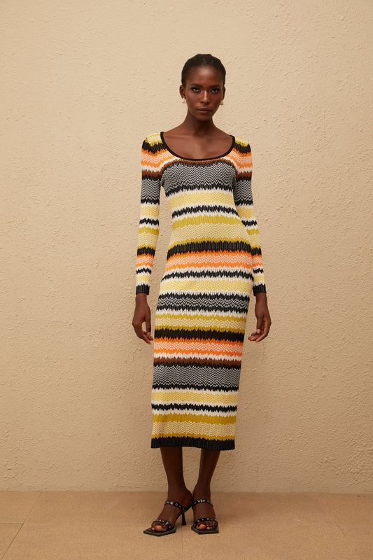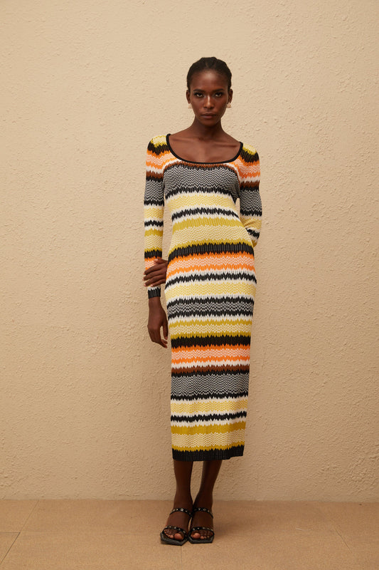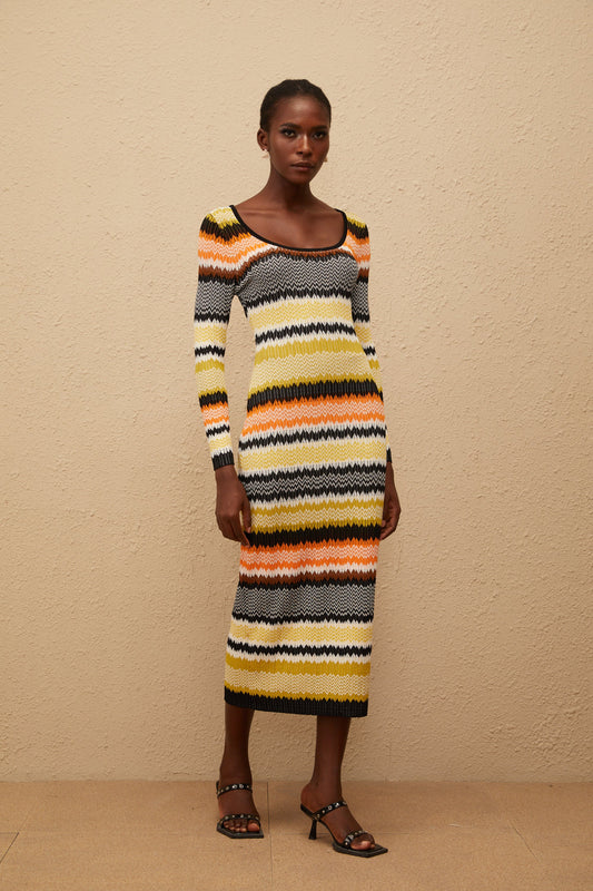 Frédérique Yellow Zigzag Woven Knit Midi Dress