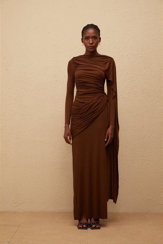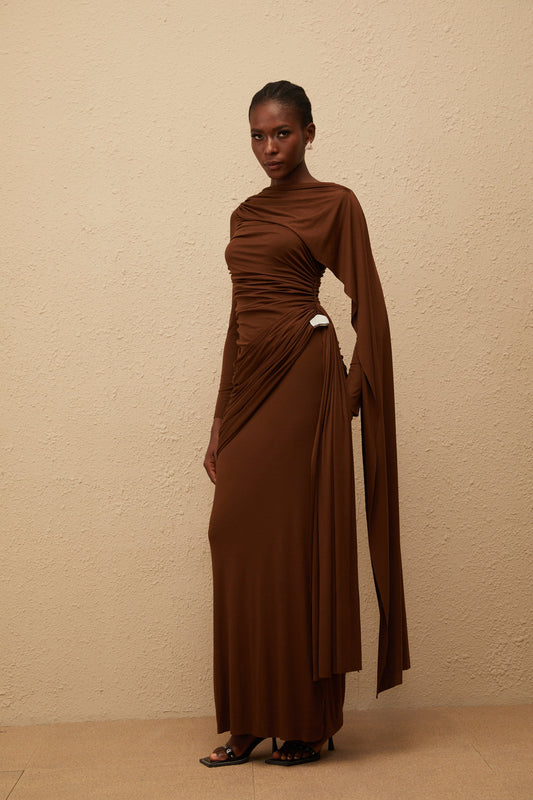 Paloma Brown Asymmetrical Ruched Knit Maxi Dress