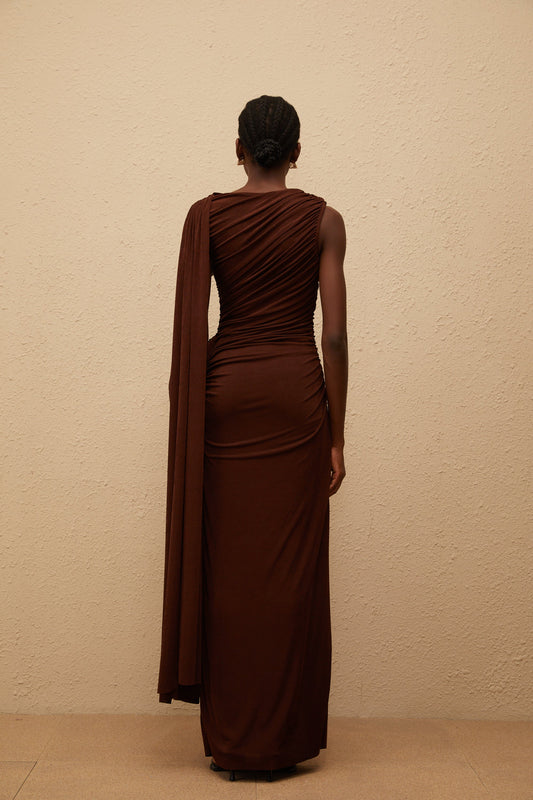 Paloma Brown Sleeveless Asymmetrical Ruched Knit Maxi Dress