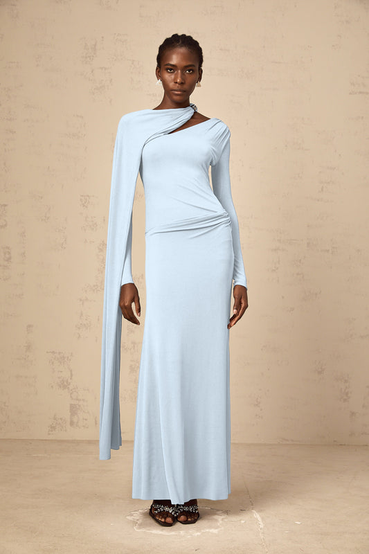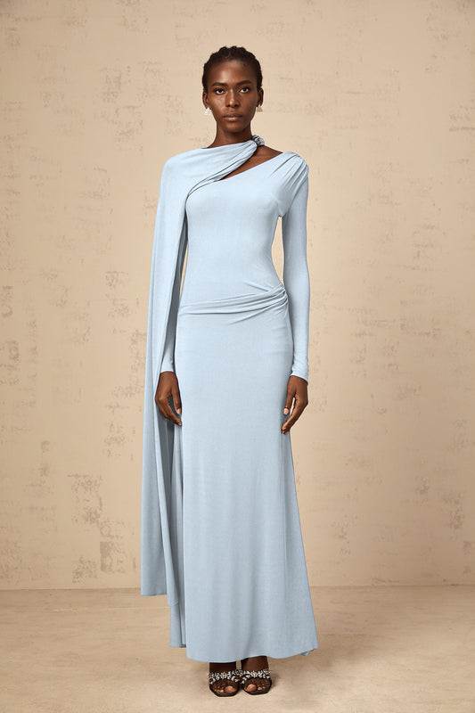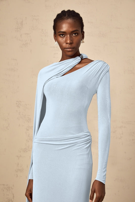Josette Blue Diagonal Shawl Fitted Maxi Dress