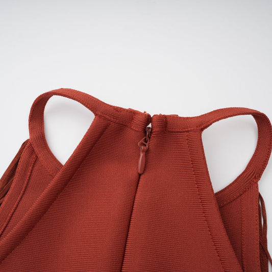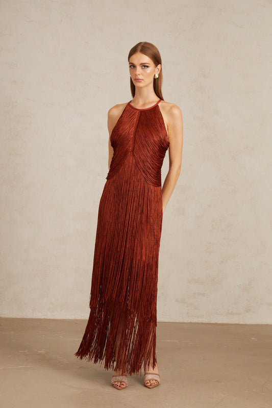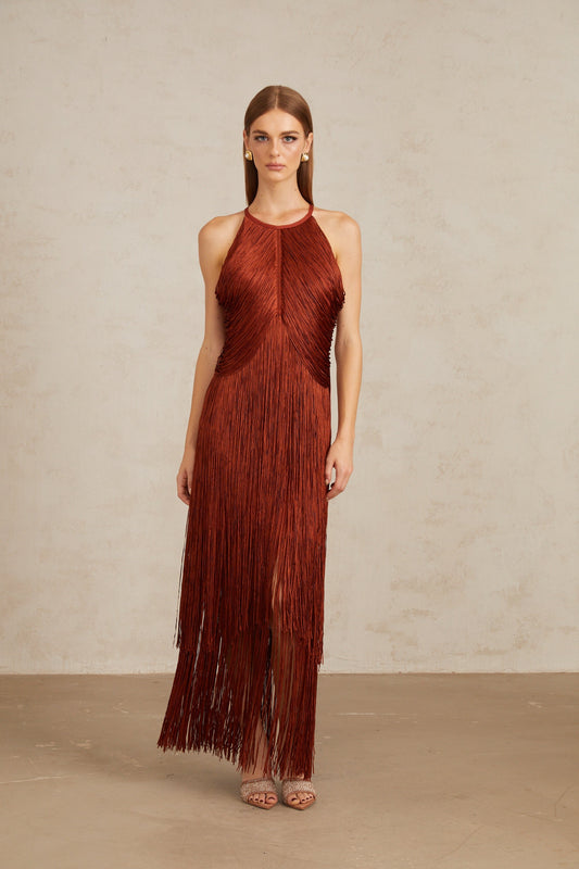 Mélisande Rusty Red Halterneck Fringed Maxi Gown