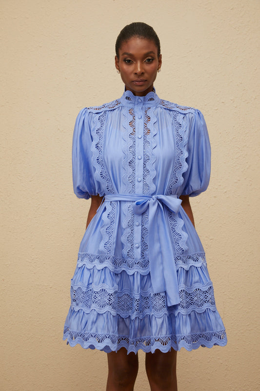 Poema Blue Tiered Motif Embroidered Mini Dress