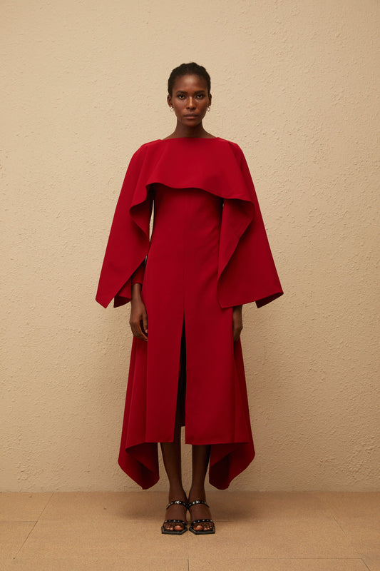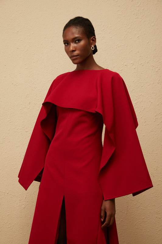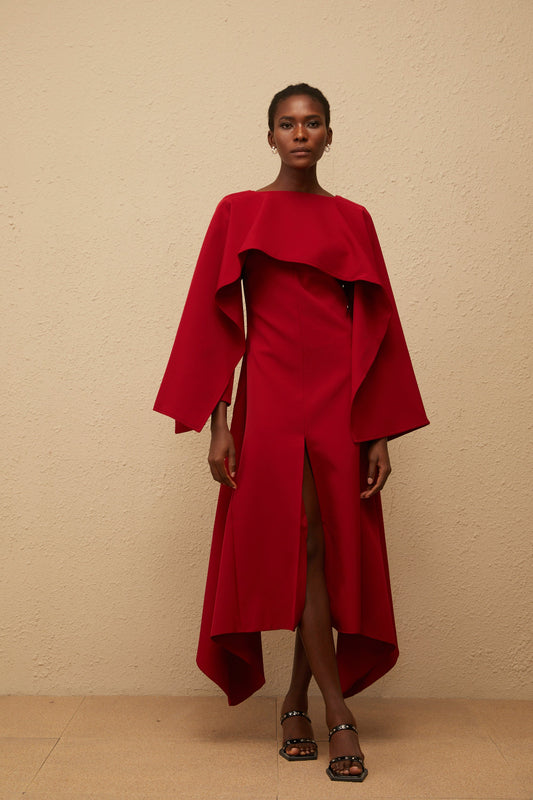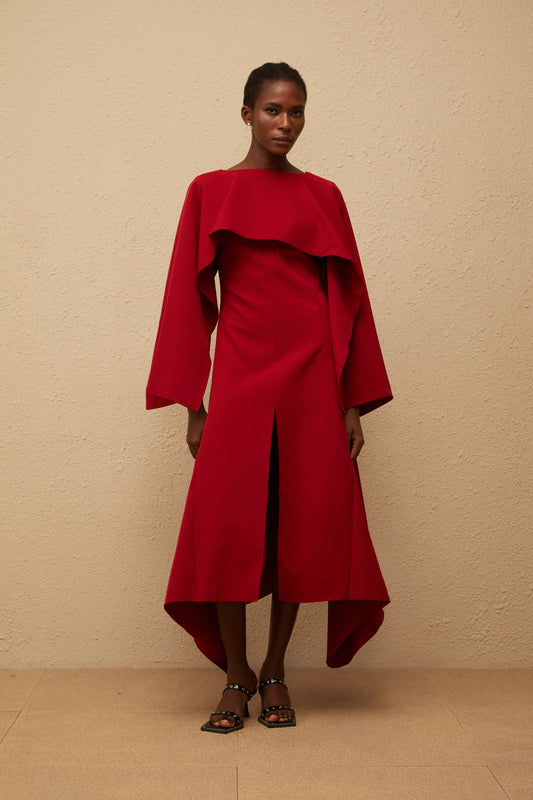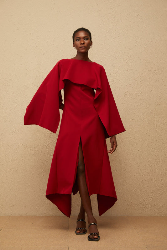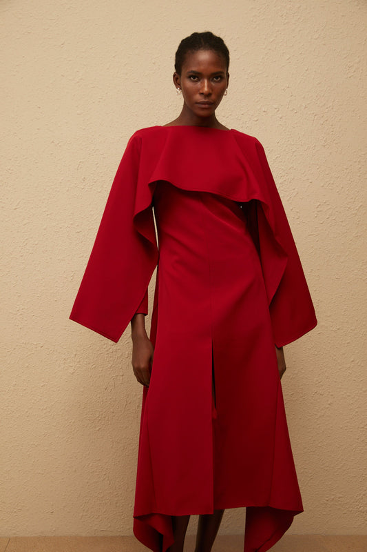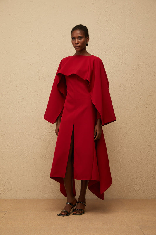 Solène Red Asymmetrical Cape Design Midi Dress