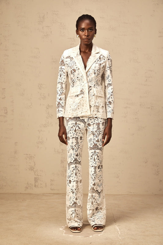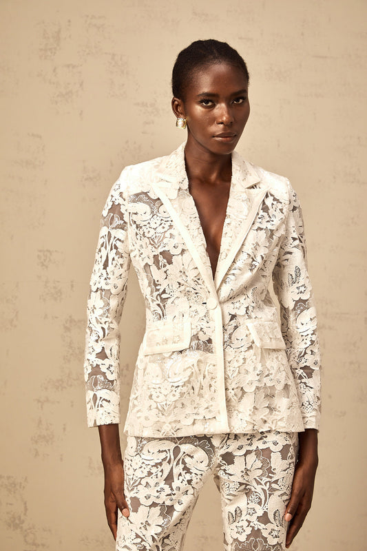 Yaelle white sequined flower-embroidered tulle blazer & trousers match