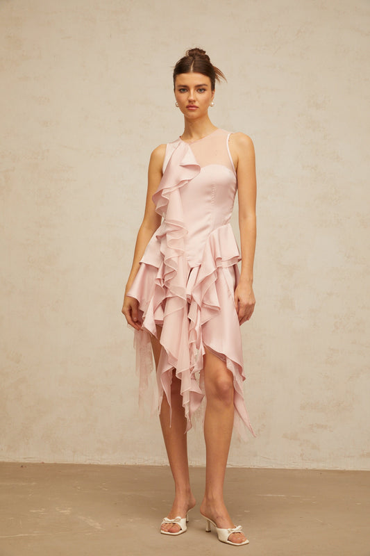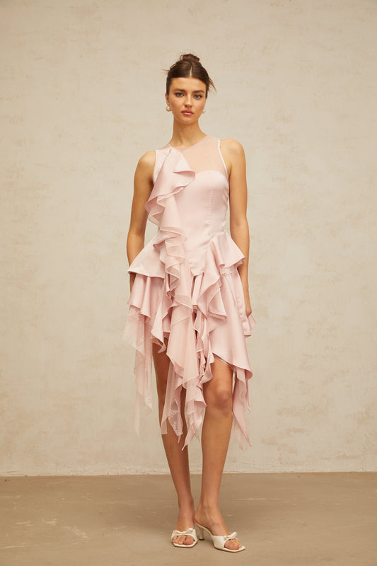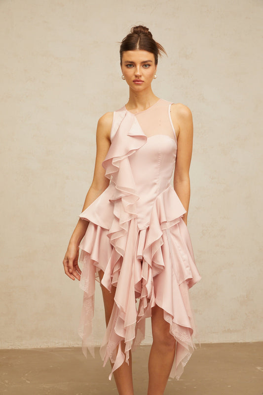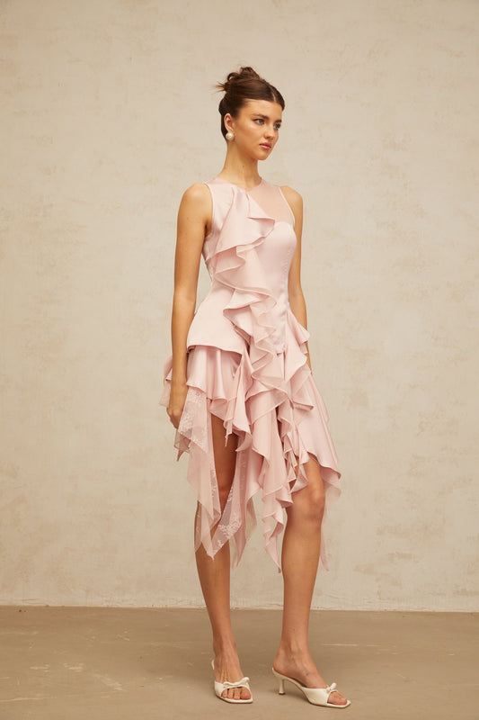 Calliopée pink asymmetrical ruffled panelled top & skirt matching set