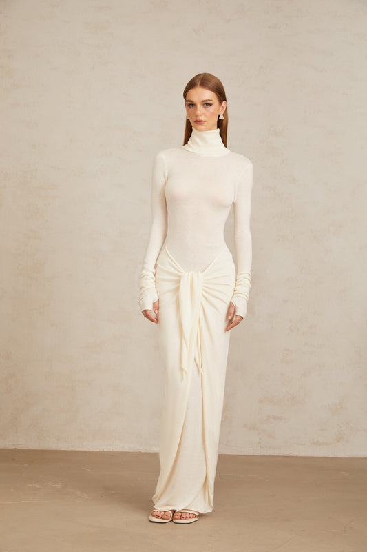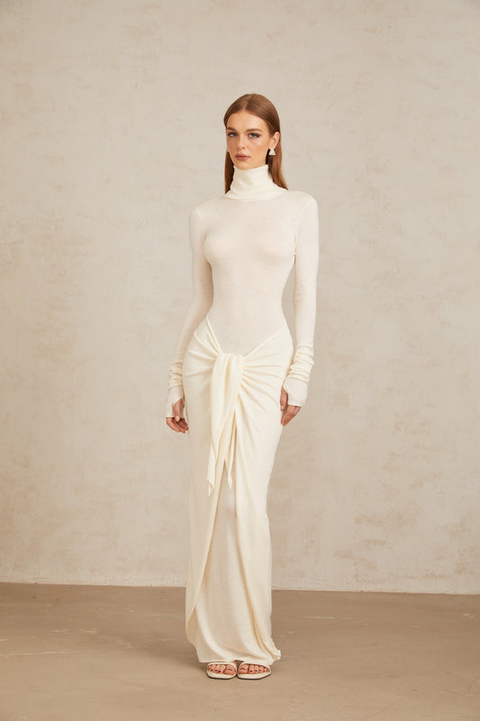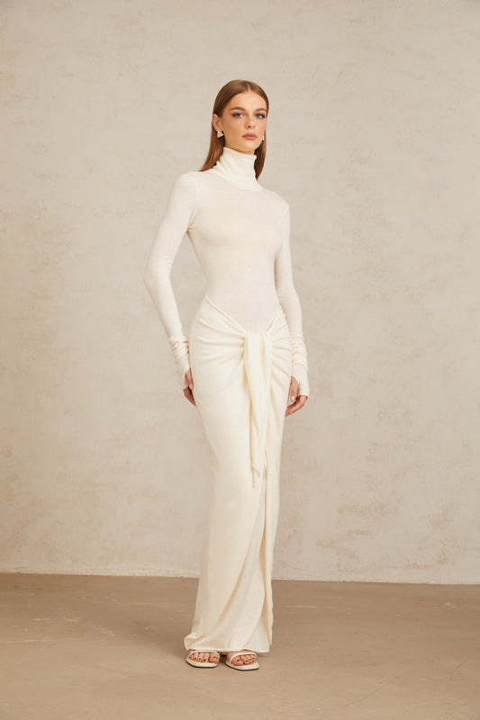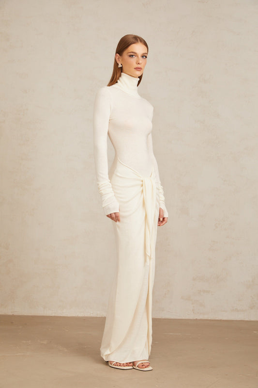 Impériale White Ruched Turtleneck Maxi Dress