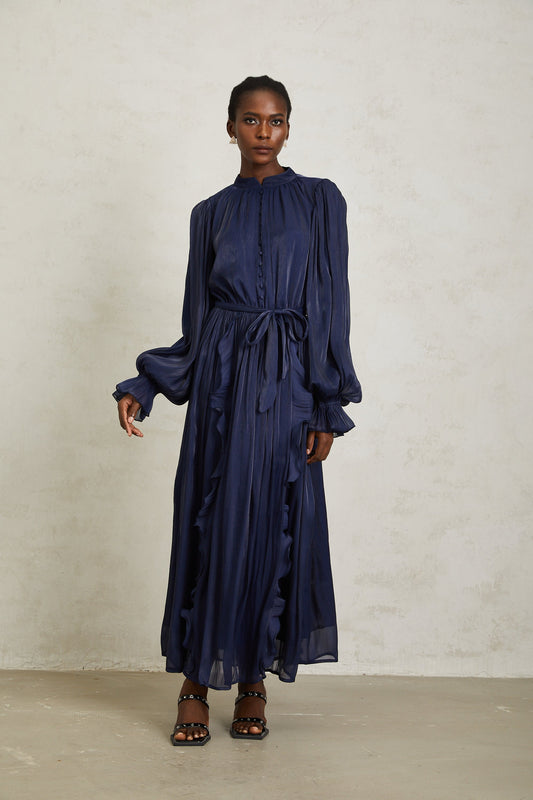 Nanette Dark Blue Glossy Pleated Maxi Dress