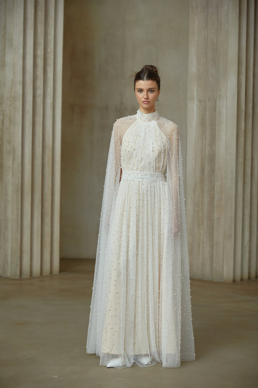 Louane white cape-design embellished tulle maxi dress