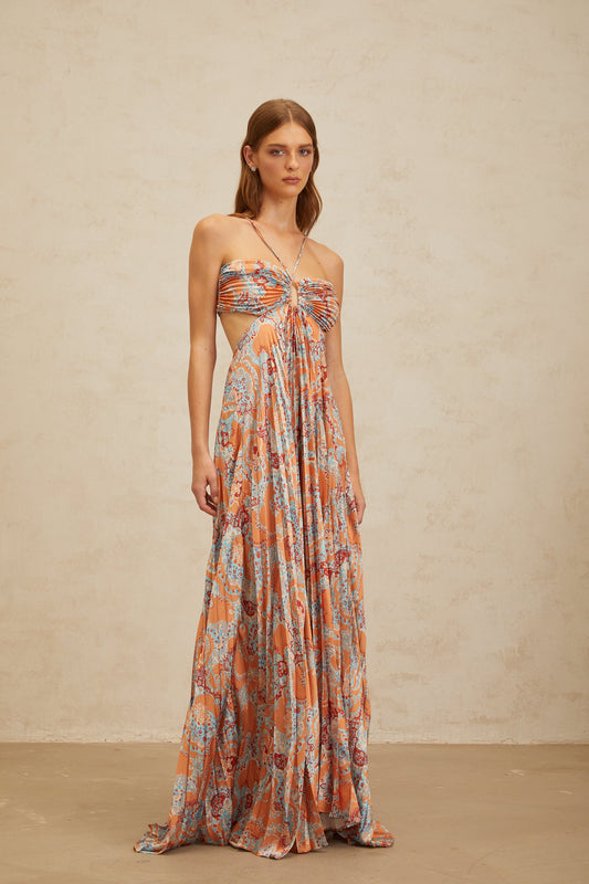 Andréa Orange Floral Print Pleated Maxi Dress with Cutout Detail