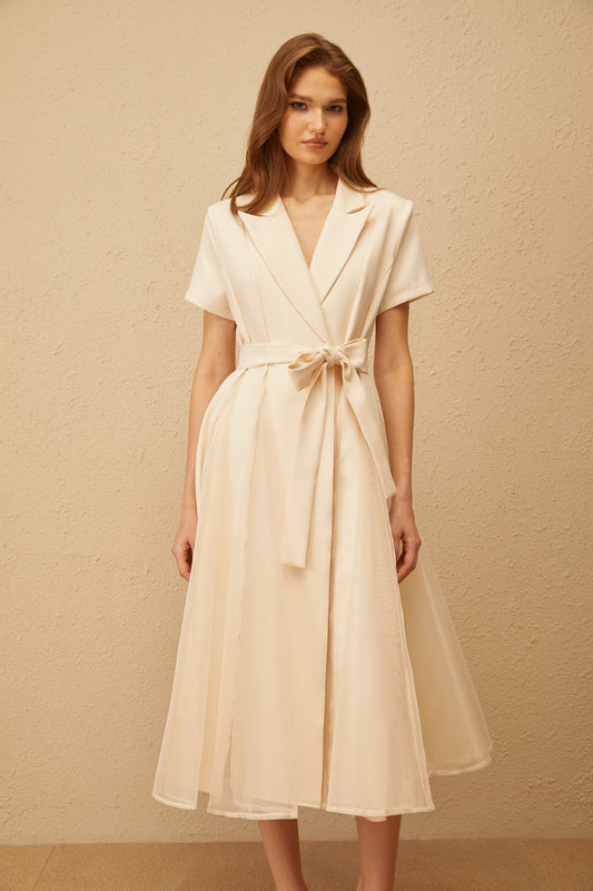 Aurore Neutral Tulle Panel Wraped Midi Dress