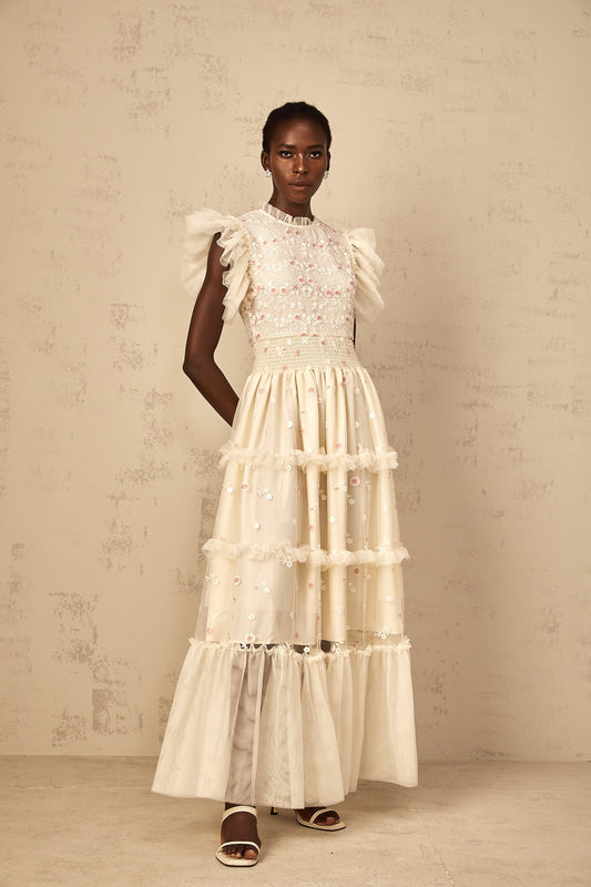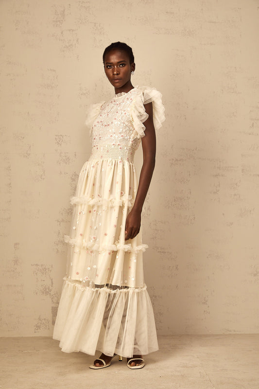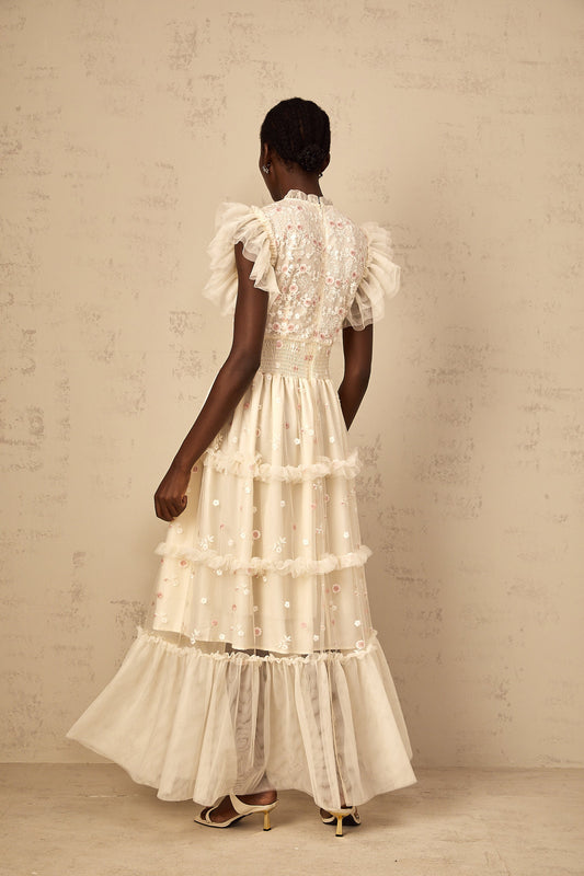 Caméo Cream White Floral Embroidered Tiered Tulle Maxi Dress