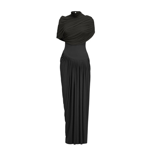 Catherine Black Asymmetrical Pleated Maxi Dress