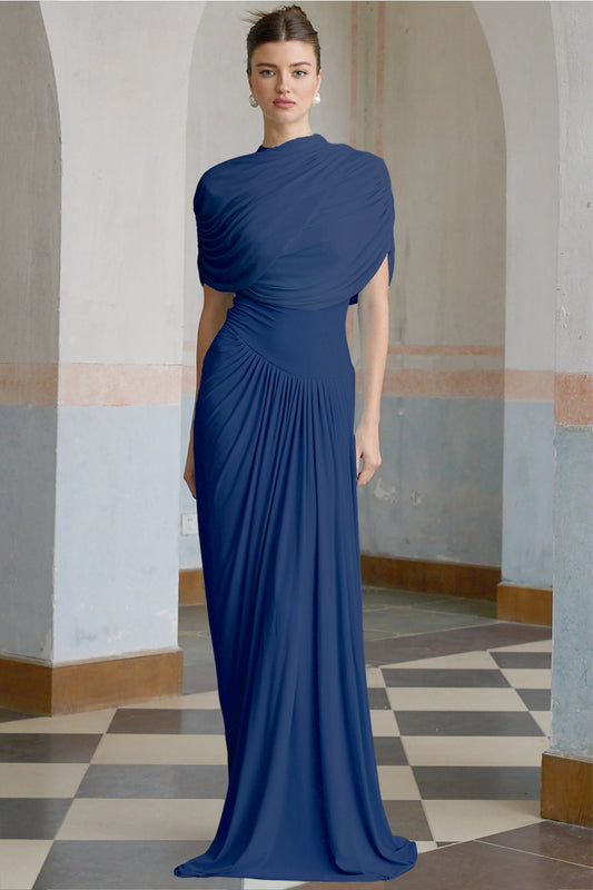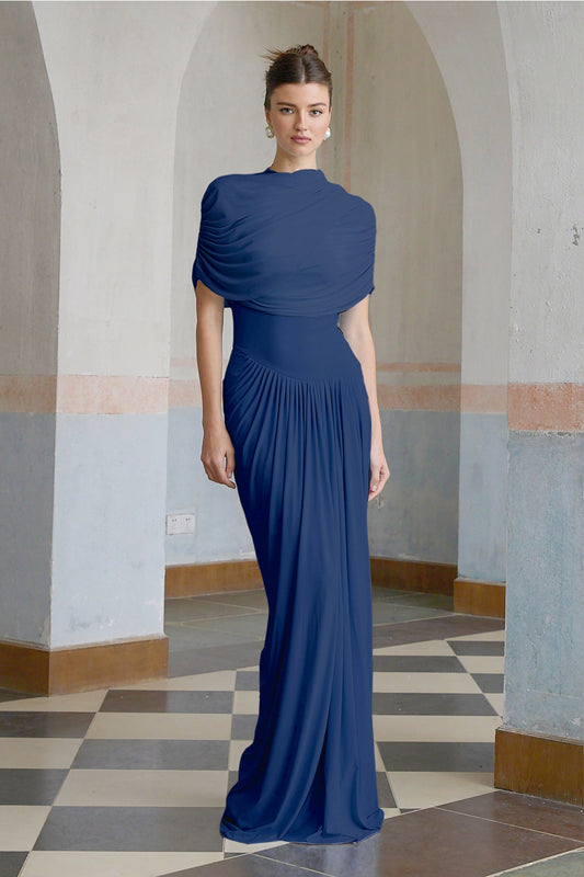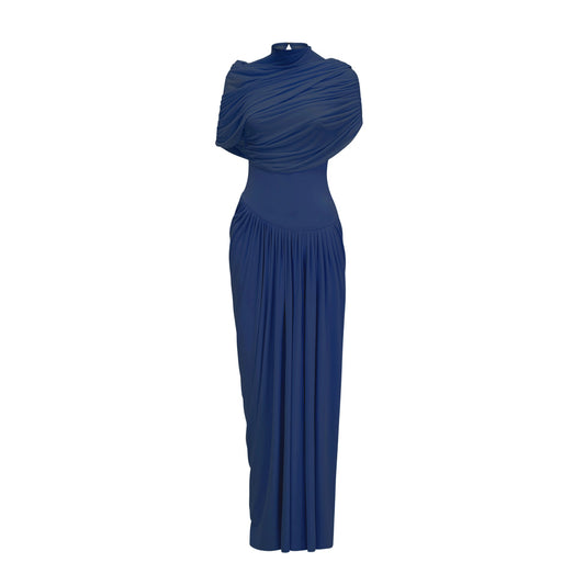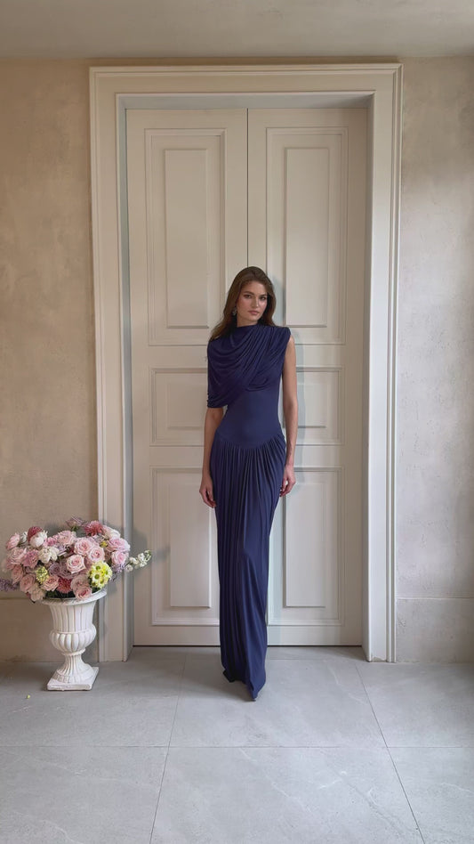 Catherine asymmetrical pleated maxi dress in Navy-blue