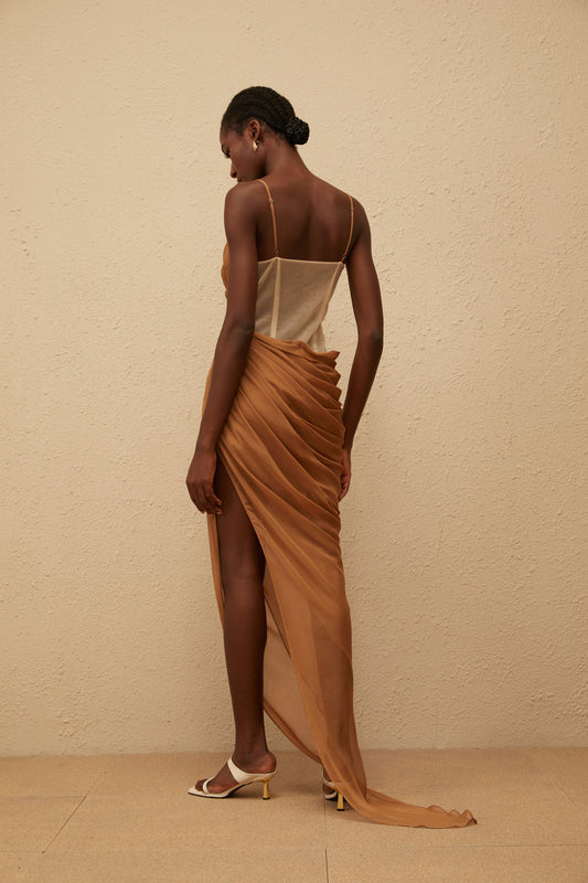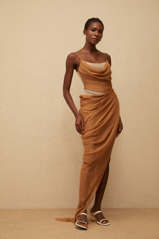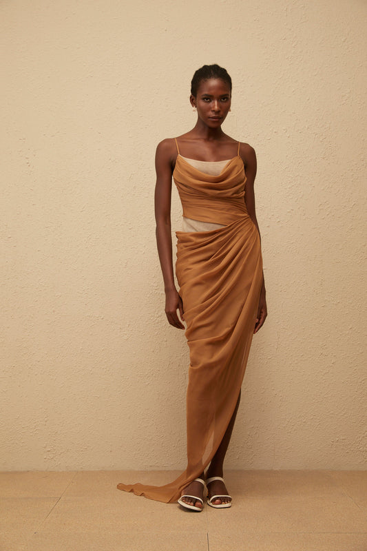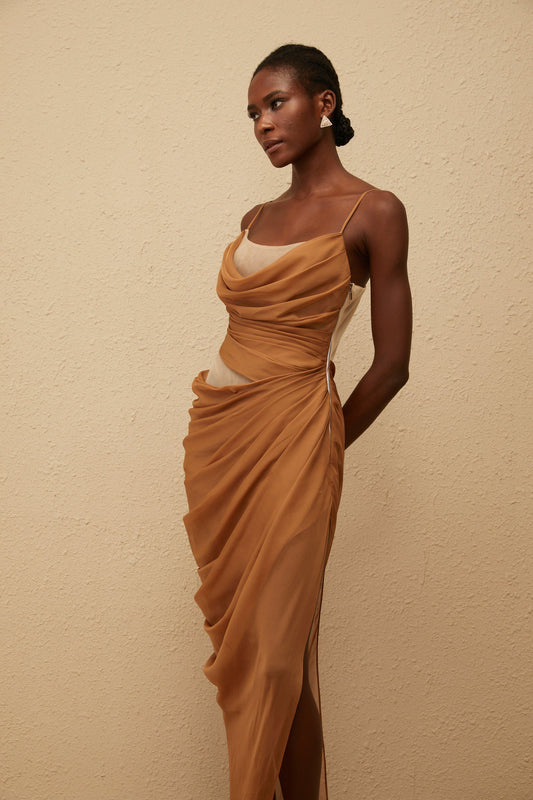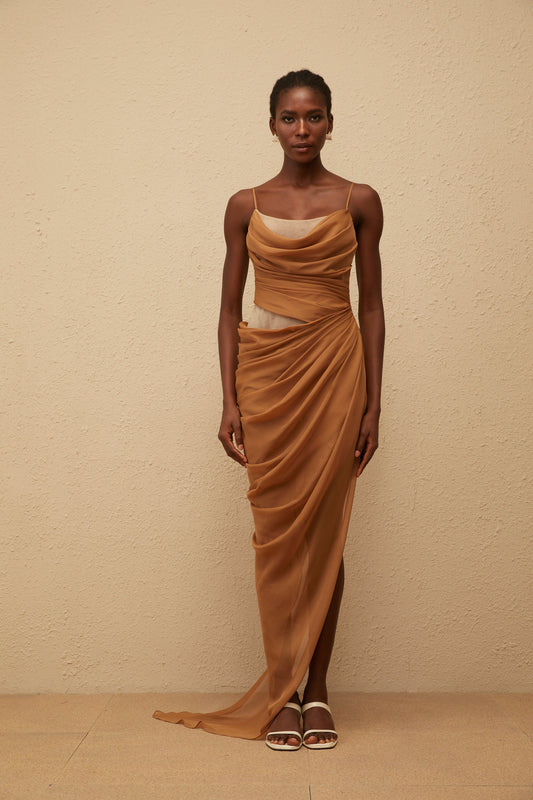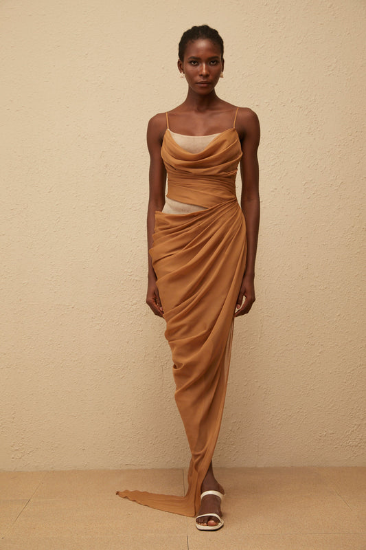 Charisa Khaki Draped Chiffon Maxi Dress