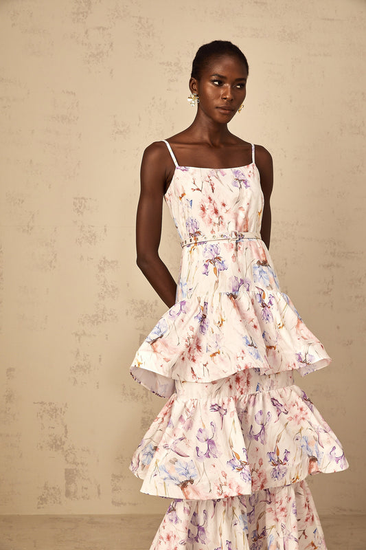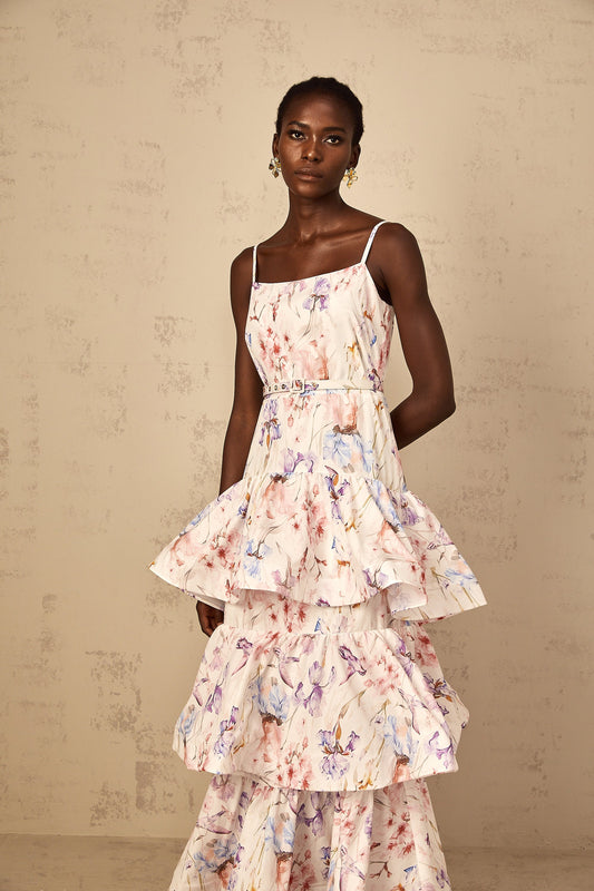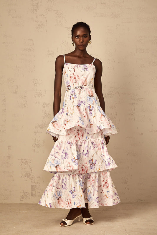Géraldine White Floral Print Ruffled Tiered Maxi Dress