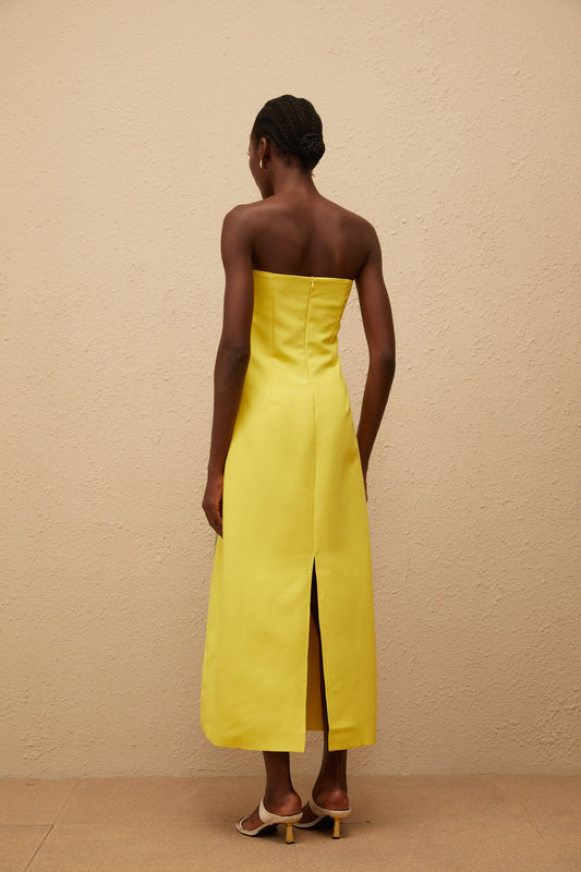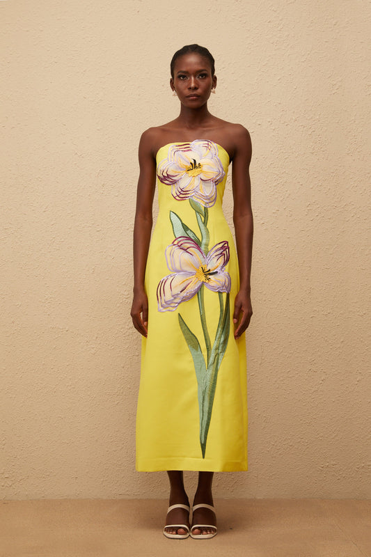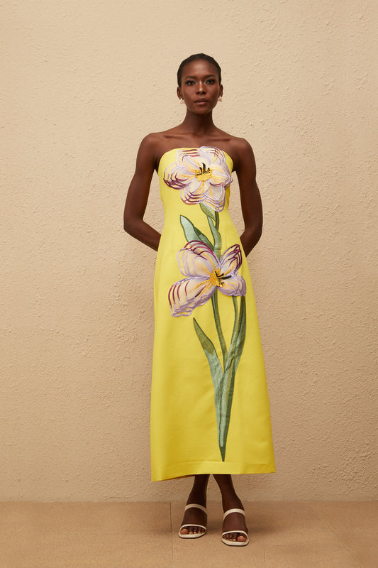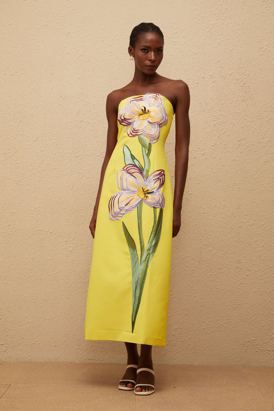 Irène Sequin Embroidered Off-Shoulder Midi Dress in Yellow