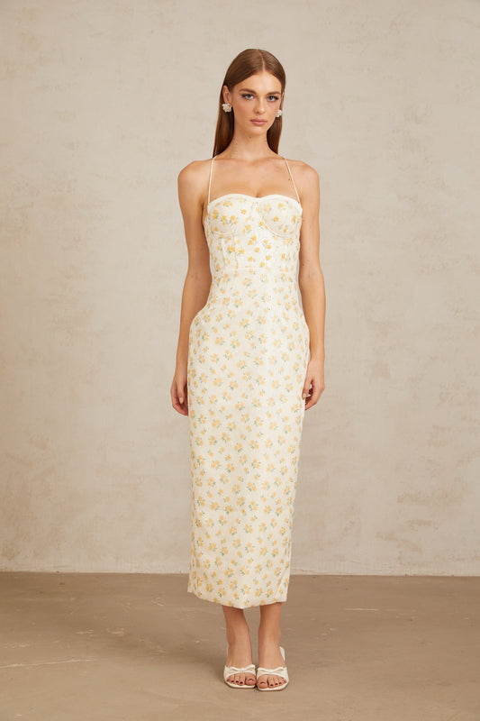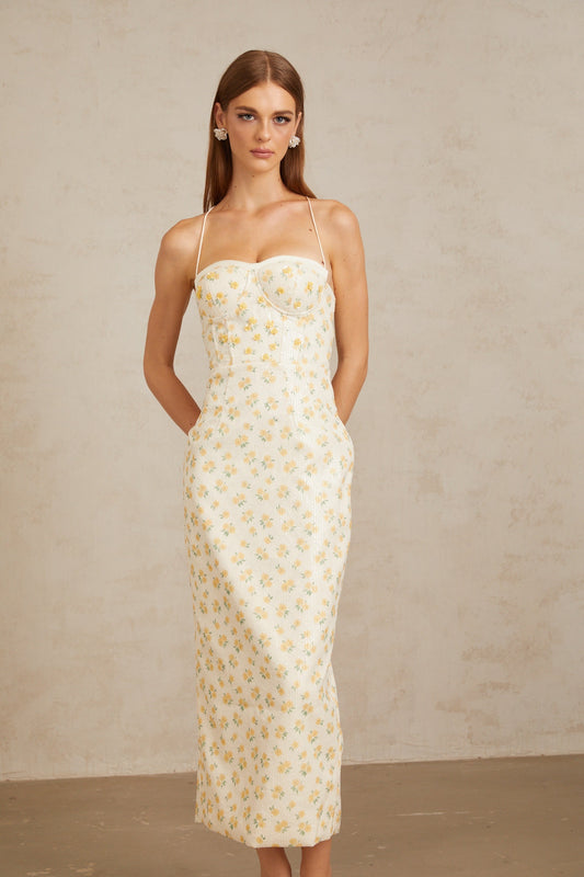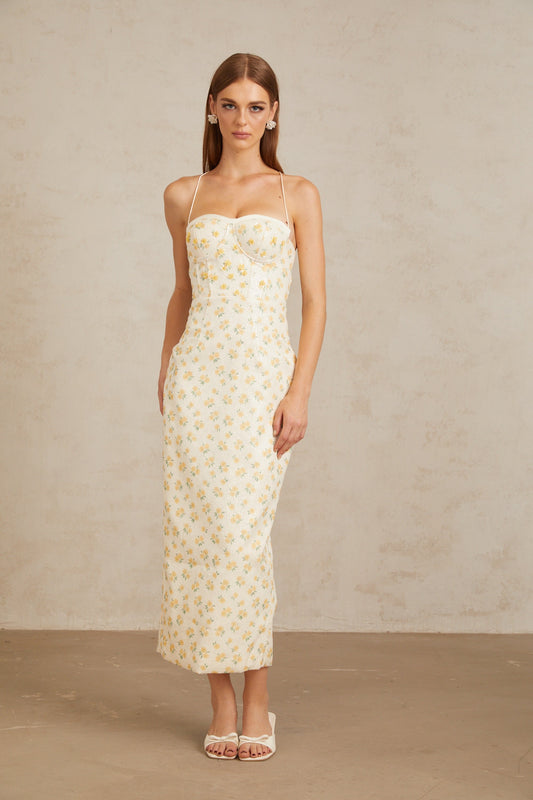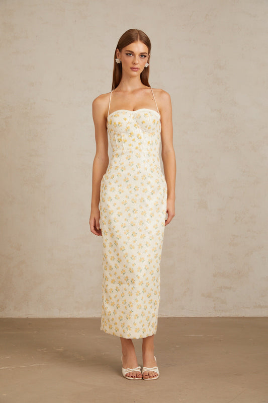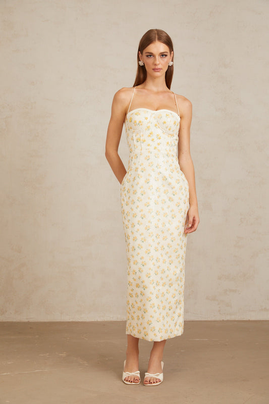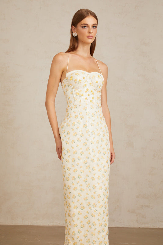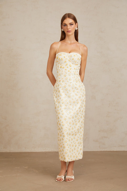 Quincia Yellow Sequined Floral Corset Maxi Gown