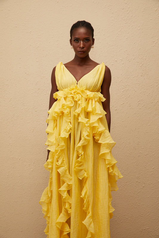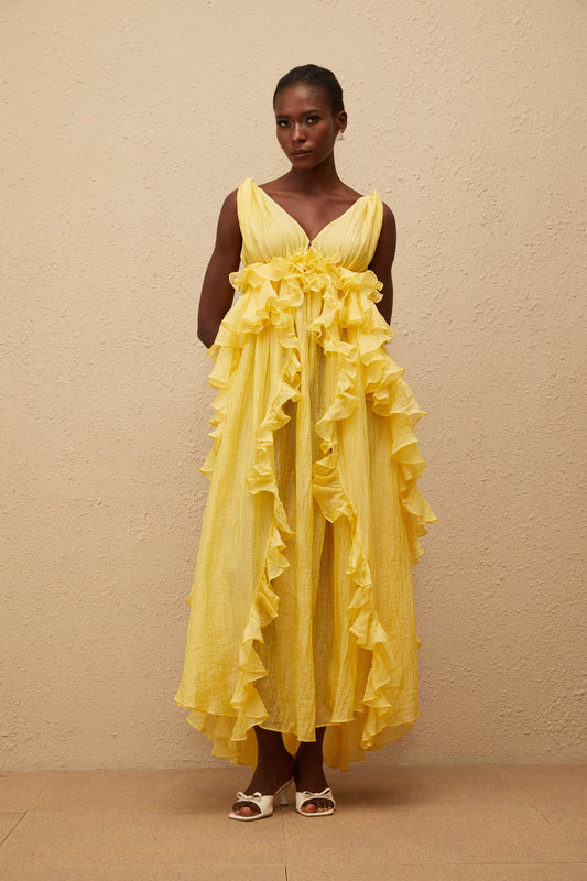 Estelle Yellow Crinkled Ruffled Maxi Dress