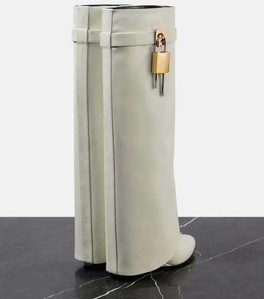 Handcrafted in Italy with fine leathers, these boots embody the essence of contemporary luxury. The sculptural design, enhanced by the iconic metal lock, transforms footwear into a true style jewel. Available in refined shades of white, black, and beige, they express three different facets of femininity: the luminous purity of white, the bold elegance of black, and the sophisticated naturalness of beige. Every detail is designed to give character and uniqueness, making these boots an everlasting symbol of elegance and modernity.