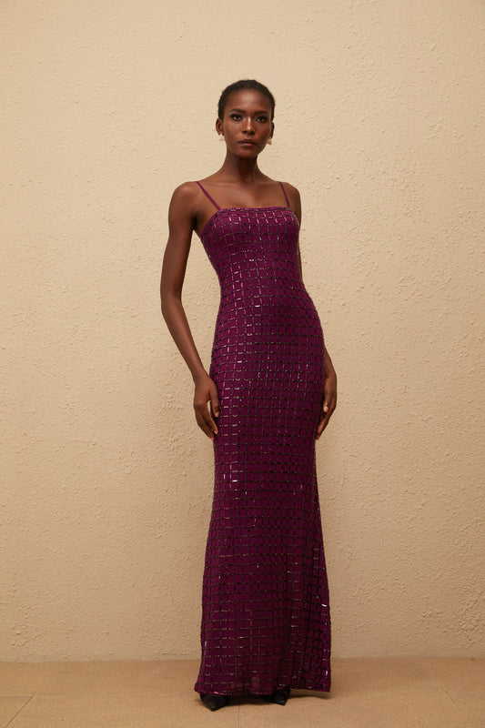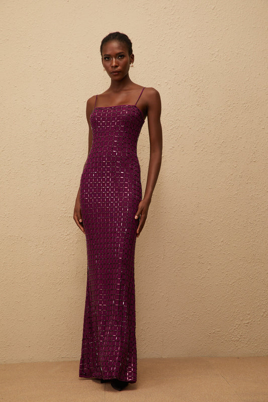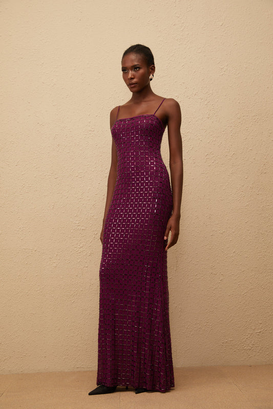Térébenthine Purple Rhinestone Mesh Maxi Dress
