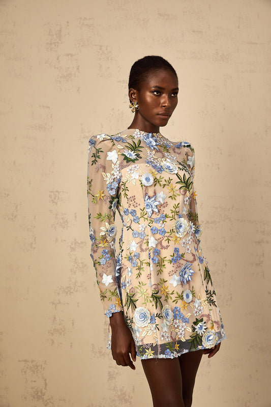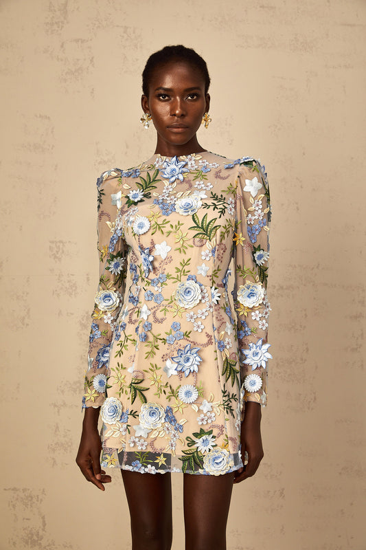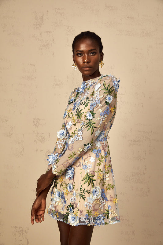 Jolien Blue Floral Appliqué Embroidered Tulle Mini Dress (US Only)
