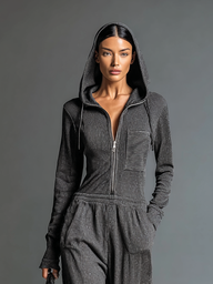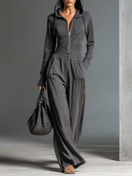 Elevate your casual look with the Women's Fashion Ribbed Zipper Hooded Jumpsuit. This stylish jumpsuit features a ribbed texture, a functional zipper, and a cozy hood, making it perfect for a trendy yet comfortable outfit.