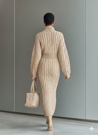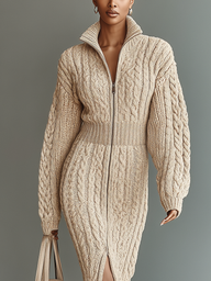 A cozy beige knit maxi dress with a cable knit pattern, front zipper, and a flattering silhouette with a front slit.