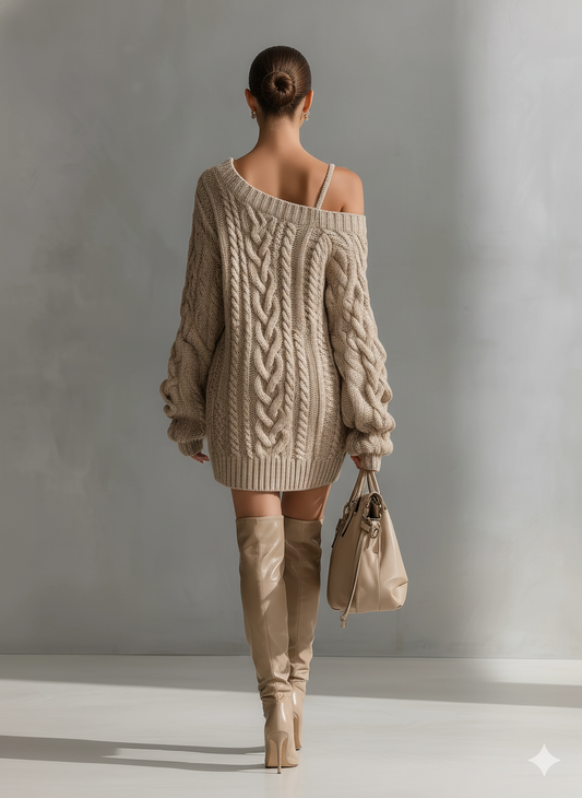 A chic beige mini dress with a cable knit texture and off-the-shoulder neckline for a stylish, modern look.