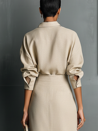 A coordinated two-piece set in a soft beige cotton blend, featuring a relaxed shirt and a matching draped skirt for an effortless, refined look.