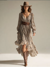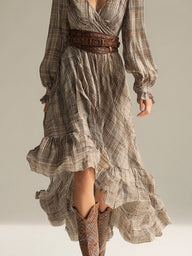A flowy, bohemian-inspired chiffon midi dress with plaid patterns and ruffled details. It offers a relaxed yet stylish look, perfect for casual outings or outdoor events.