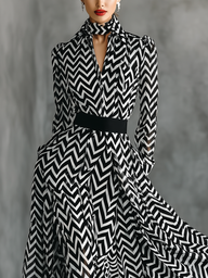 This flowing chiffon dress features a bold herringbone pattern with a cinched waist and tie-up neck detail. The soft fabric and full skirt create elegant movement.