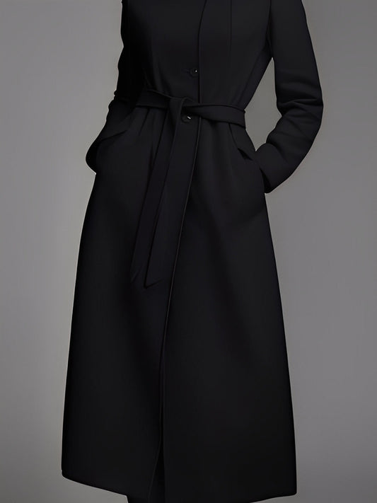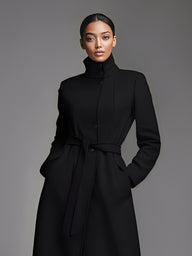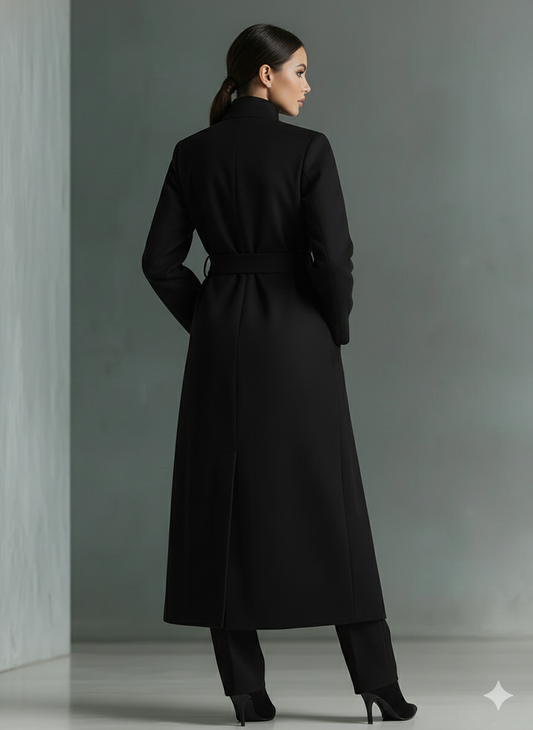 Women’s Black Elegant Wool-Blend Stand-Collar Belted Maxi Coat